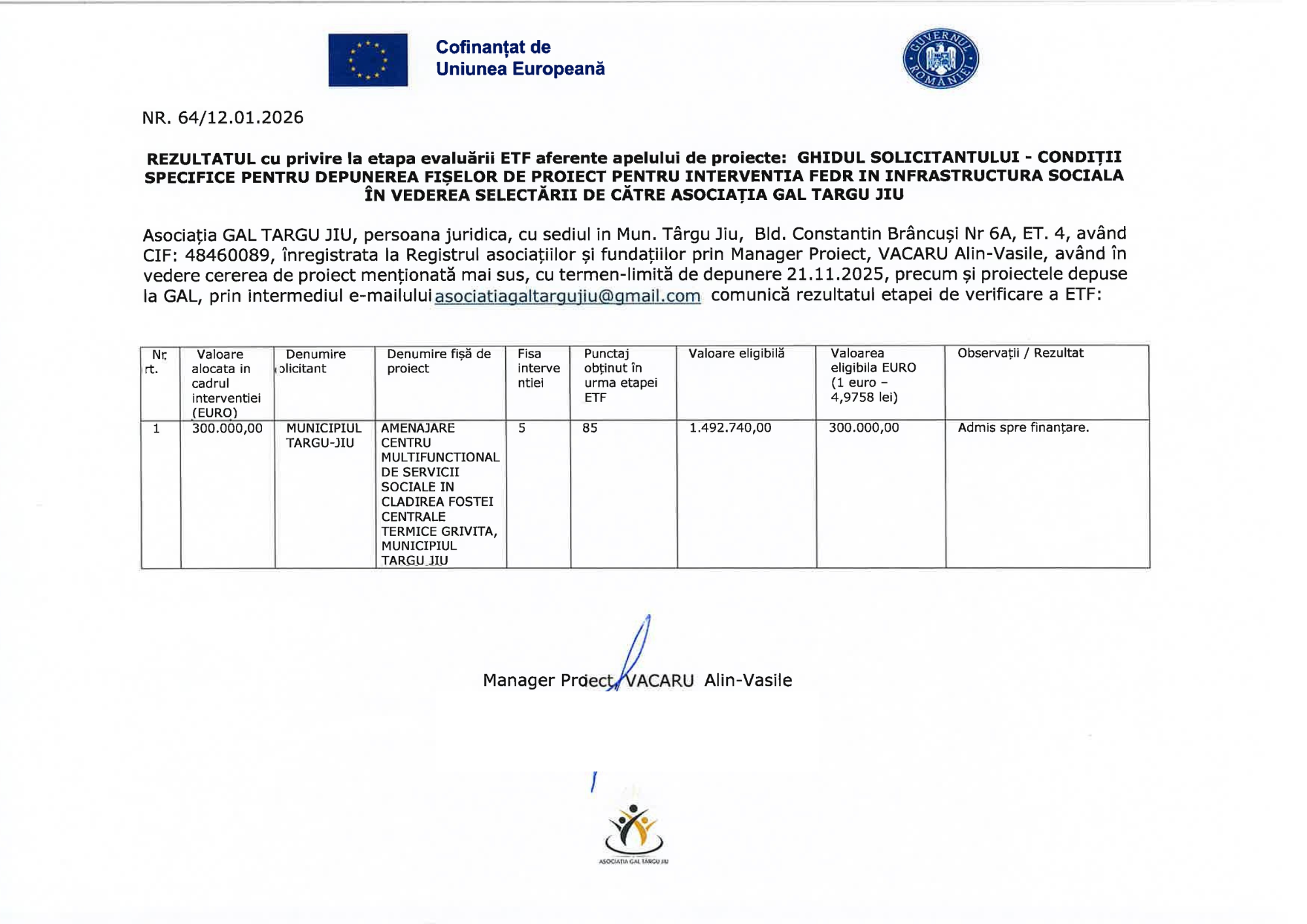 Asociația GAL TARGU JIU, persoana juridica, cu sediul in Mun. Târgu Jiu, Bld. Constantin Brâncuşi Nr 6A, ET. 4, având CIF: 48460089, înregistrata la Registrul asociațiilor și fundațiilor prin Manager Proiect, VACARU Alin-Vasile, având în vedere cererea de proiect menționată mai sus, cu termen-limită de depunere 21.11.2025, precum și proiectele depuse la GAL, prin intermediul e-mailului asociatiagaltargujiu@gmail.com comunică rezultatul etapei de verificare a ETF: